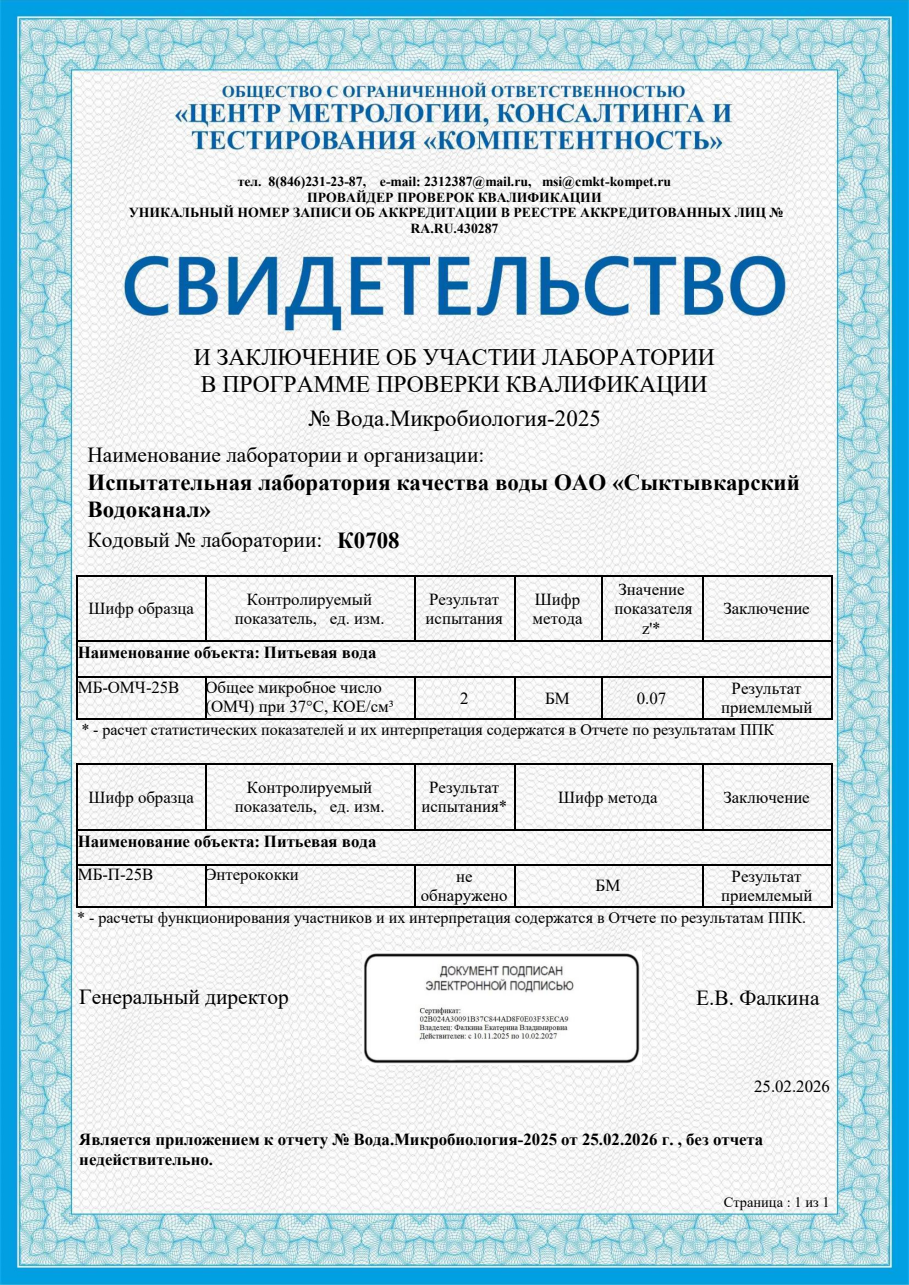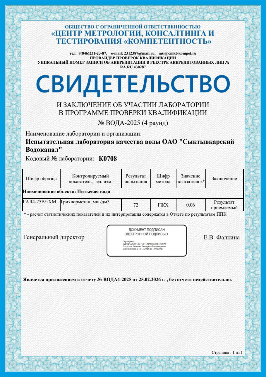 Испытательная лаборатория качества воды АО «Сыктывкарский Водоканал» приняла участие в 4 раунде программы проверки квалификации (ПК) «№ ВОДА-2025» по следующим показателям: